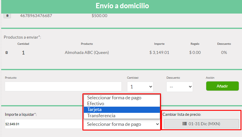 Selecciona el método de pago que utilizará el cliente para liquidar en su domicilio, y selecciona la lista de precios correcta.